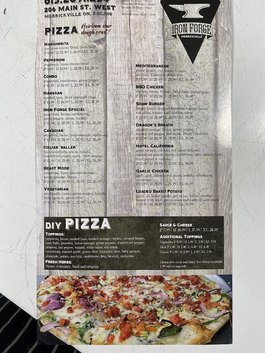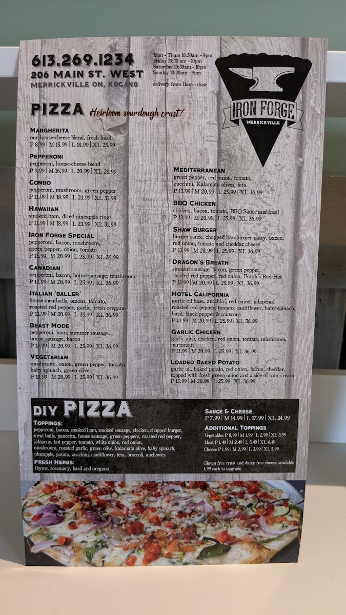 Welcome to Iron Forge Pizza, a culinary gem located at 206 Main St W, Merrickville-Wolford, ON. This cozy eatery is making waves with its mouthwatering menu that boasts a variety of pizzas, sandwiches, and poutines that are crafted with care and quality ingredients. Customers rave about the perfectly cooked pizzas with a crisp, sourdough crust and vibrant toppings that pack a flavorful punch. Notable mentions include the Anvil Burger and South West sandwich, each delivering a satisfying bite.